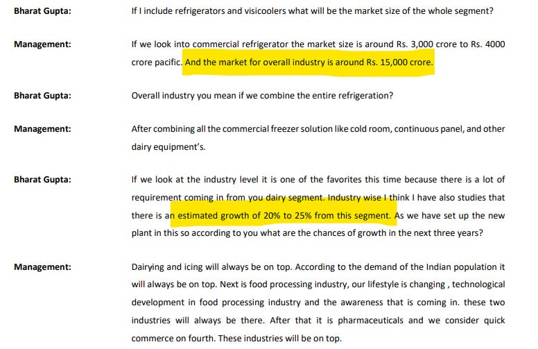 According to management, the total addressable market is around ₹15,000 crore—with commercial refrigeration (cold rooms, visicoolers, etc.) forming ₹3,000–₹4,000 crore of that.