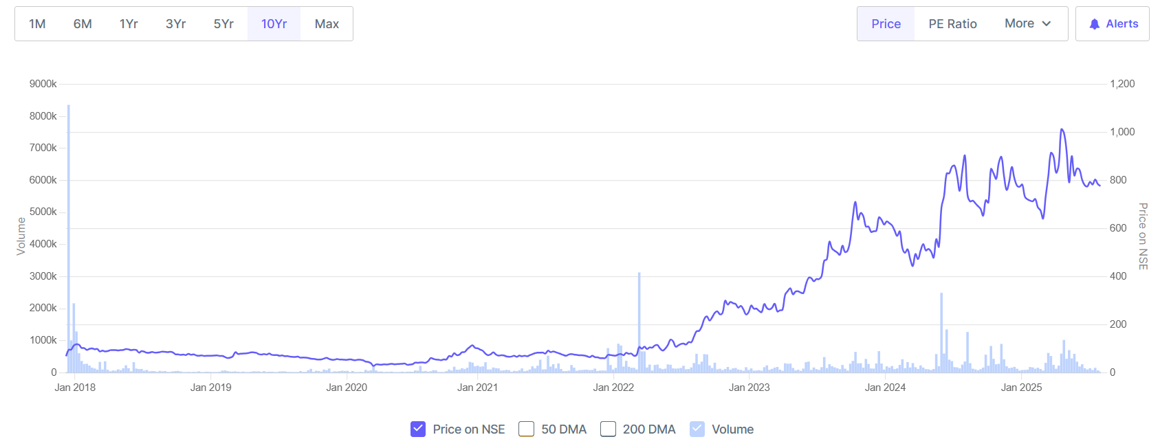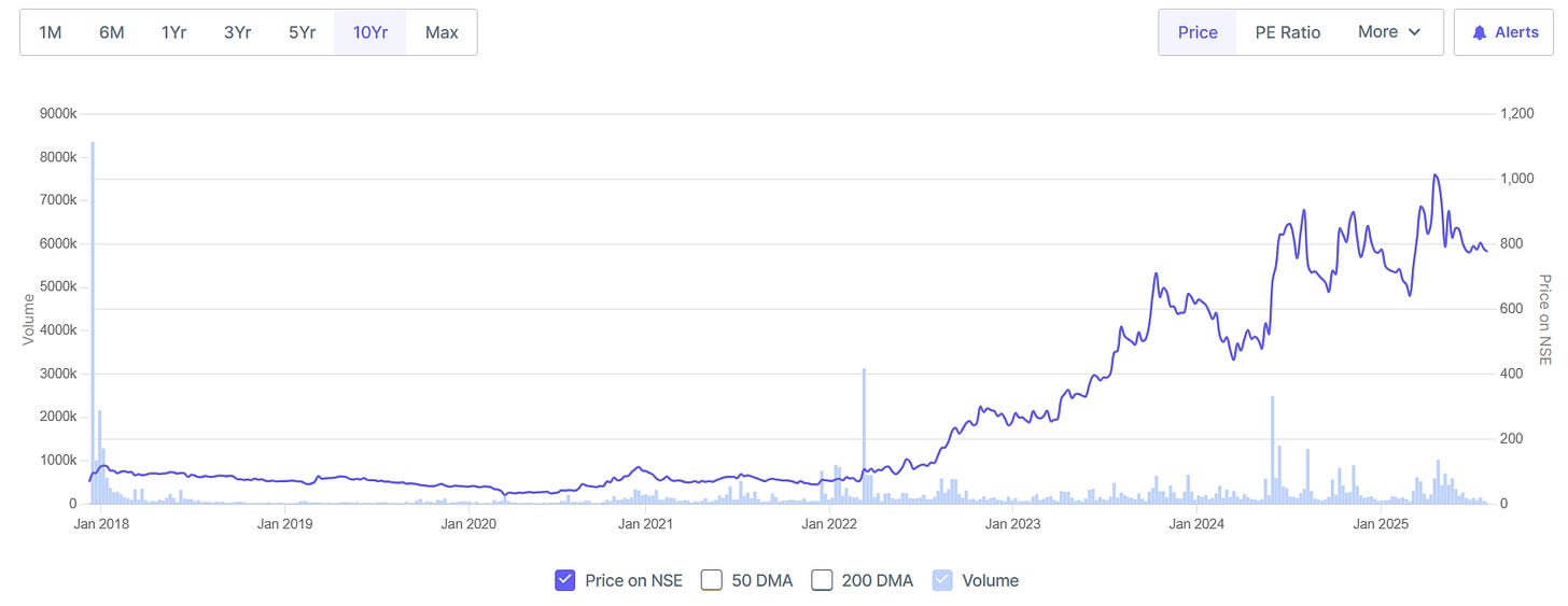 At the current price (~₹800), that translates to a forward P/E of ~32x to 38x—and that’s without assuming any upside surprise in margins or operating leverage kicking in harder.